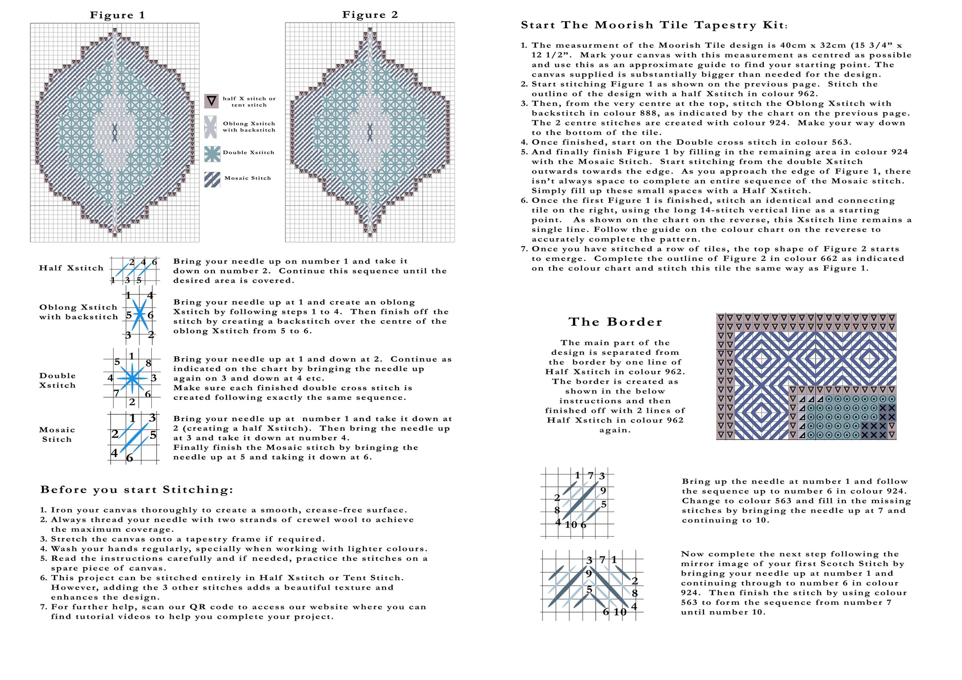 4. Instructions: Clear and detailed instructions are included to guide you through the entire process of creating your Moorish Tiles tapestry. From setting up the canvas to stitching techniques, the instructions provide step-by-step guidance.  The instructions also include very clear instructions of all the stitches used and a colour and symbol chart.